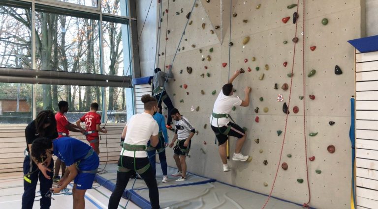 Die große Sporthalle ermöglicht ein breites sportliches Angebot: Neben Leichtathletik, allen gängigen Ball- und Rückschlagspielen steht unseren Schülerinnen und Schülern auch eine beeindruckende Kletterwand zur Verfügung. Diese ermöglicht sowohl das Bouldern als auch das Klettern mit Toprope und weiteren Sicherungstechniken. Für kletterbegeisterte Schülerinnen und Schüler bieten wir zudem eine Kletter-AG an. Weitere Informationen dazu finden Sie im Aushang in der Schule.